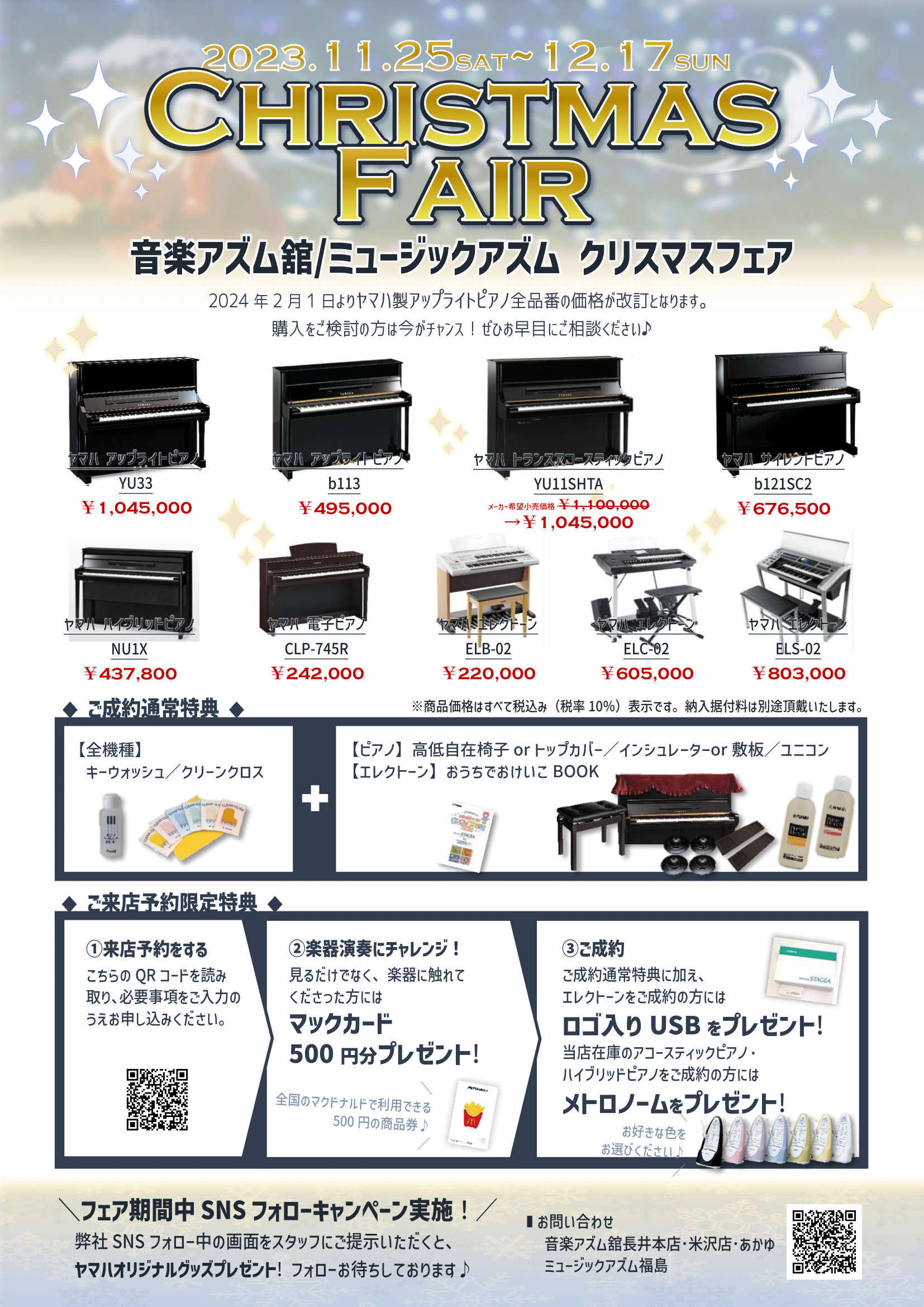 2023年11月25日~12月17日の期間中、音楽アズム舘/ミュージックアズム全店においてクリスマスフェアを開催いたします。